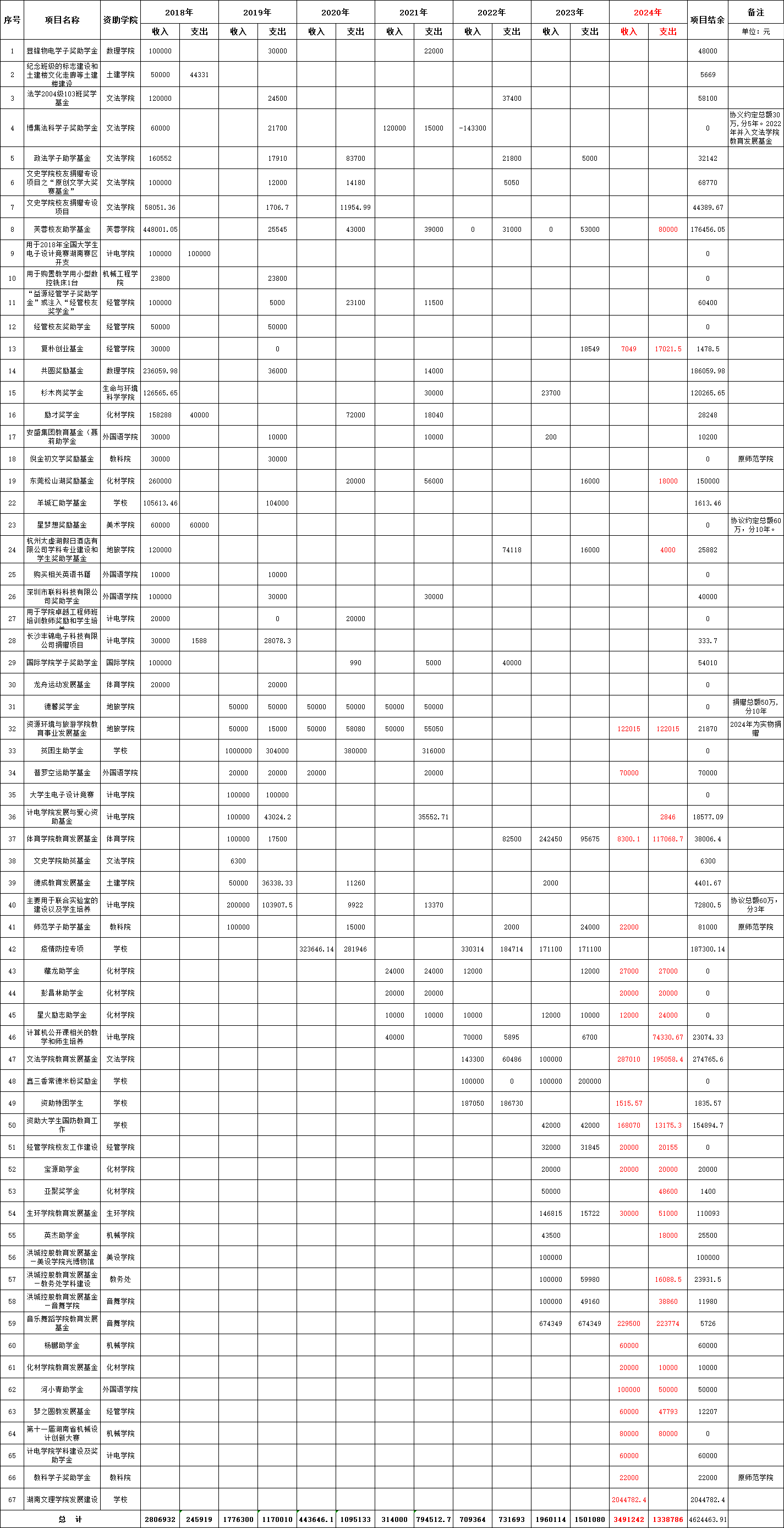 湖南文理学院教育发展基金会捐赠项目收支明细表(截止2024年底)